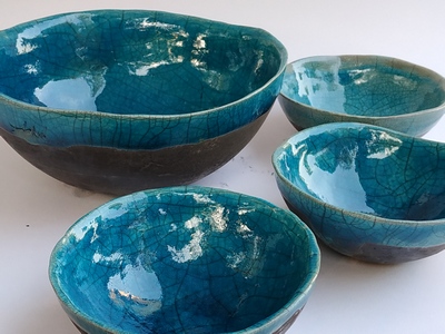 Je propose donc 2 thèmes de stage : "faïence et terre vernissée " et "grès et raku". Ces stages sont adaptés à tous les niveaux : débutants(es) comme expérimentés(es). En effet, les groupes de stagiaires sont restreints ; en moyenne 7 personnes (9 stagiaires maximum). Je m'adapte donc parfaitement à l'attente de chacun-e. Et, si vous le souhaitez, il vous est tout à fait possible soit de n'aborder qu'un seul des 2 thèmes, soit d'aborder les 2 thèmes et pratiquer lors du même stage le travail des 2 types de terre, faïence et grès, et obtenir ainsi des pièces finalisées terre vernissée et raku.